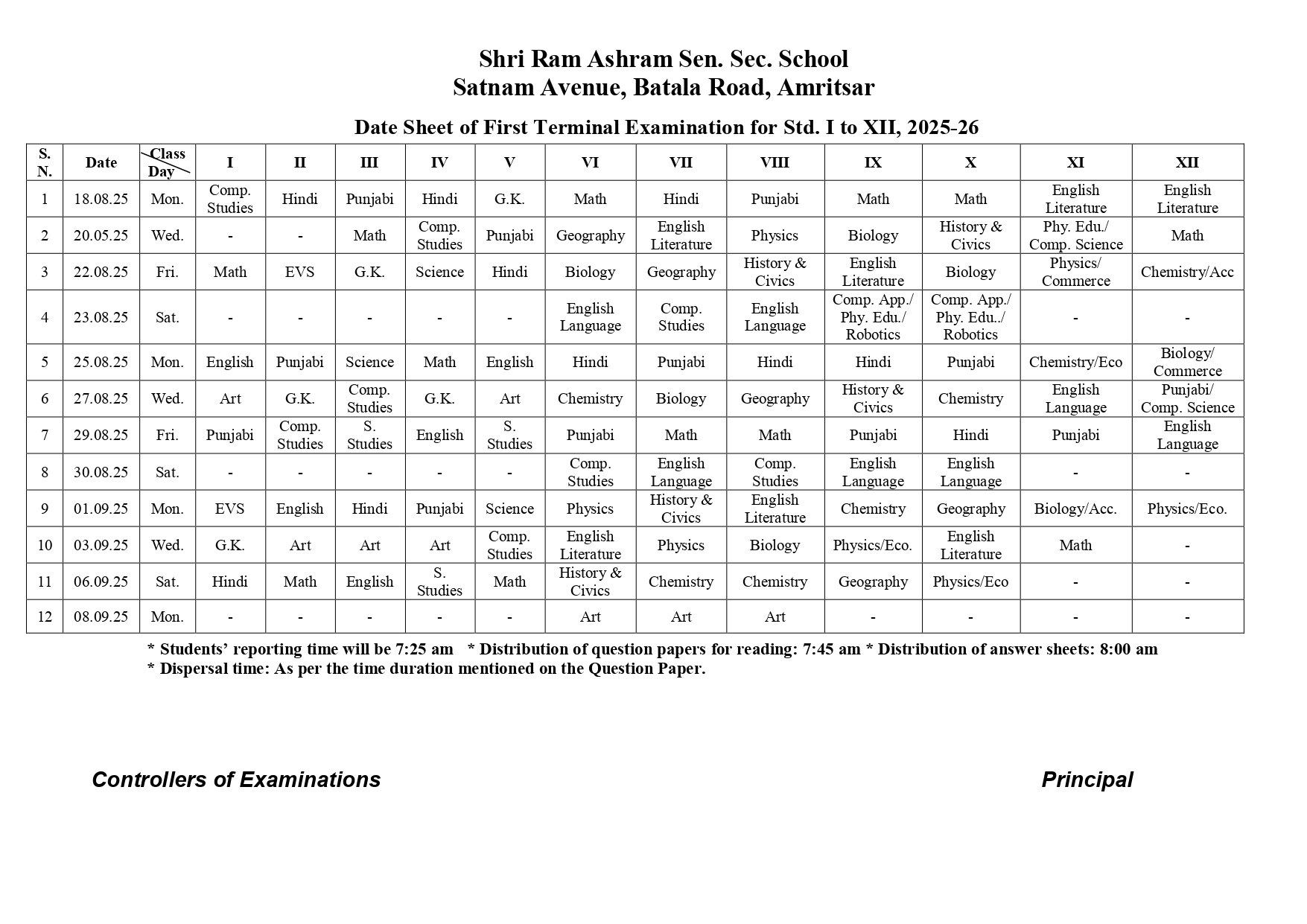 DATE SHEET (FIRST TERM) 2025-26